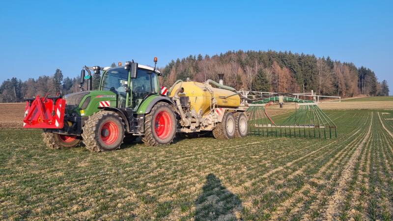 Mit unserem 12.5 Kubik Hadorn Güllefass bringen wir mit einem 12 Meter Schleppschlauch die Gülle aus. Zudem haben wir Maisbereifung für den Traktor und das Güllefass. Damit können wir auch spät dem Mais noch Hofdünger zuführen und so die Nährstoffe bis zum Abreifen sicherstellen. Das Güllefass ist mit einer grossvolumigen Bereifung und einem Reifendruckregelsystem zur Bodenschonung ausgerüstet.